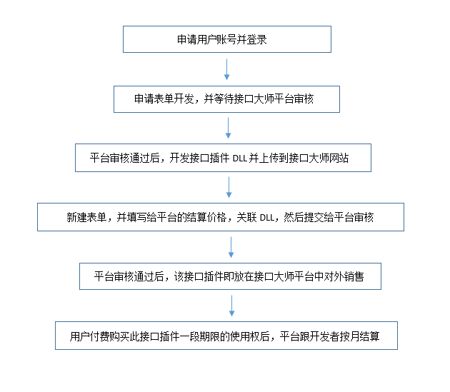用户付费购买此接口插件一定期限的使用权后,平台每月分钱给开发者。